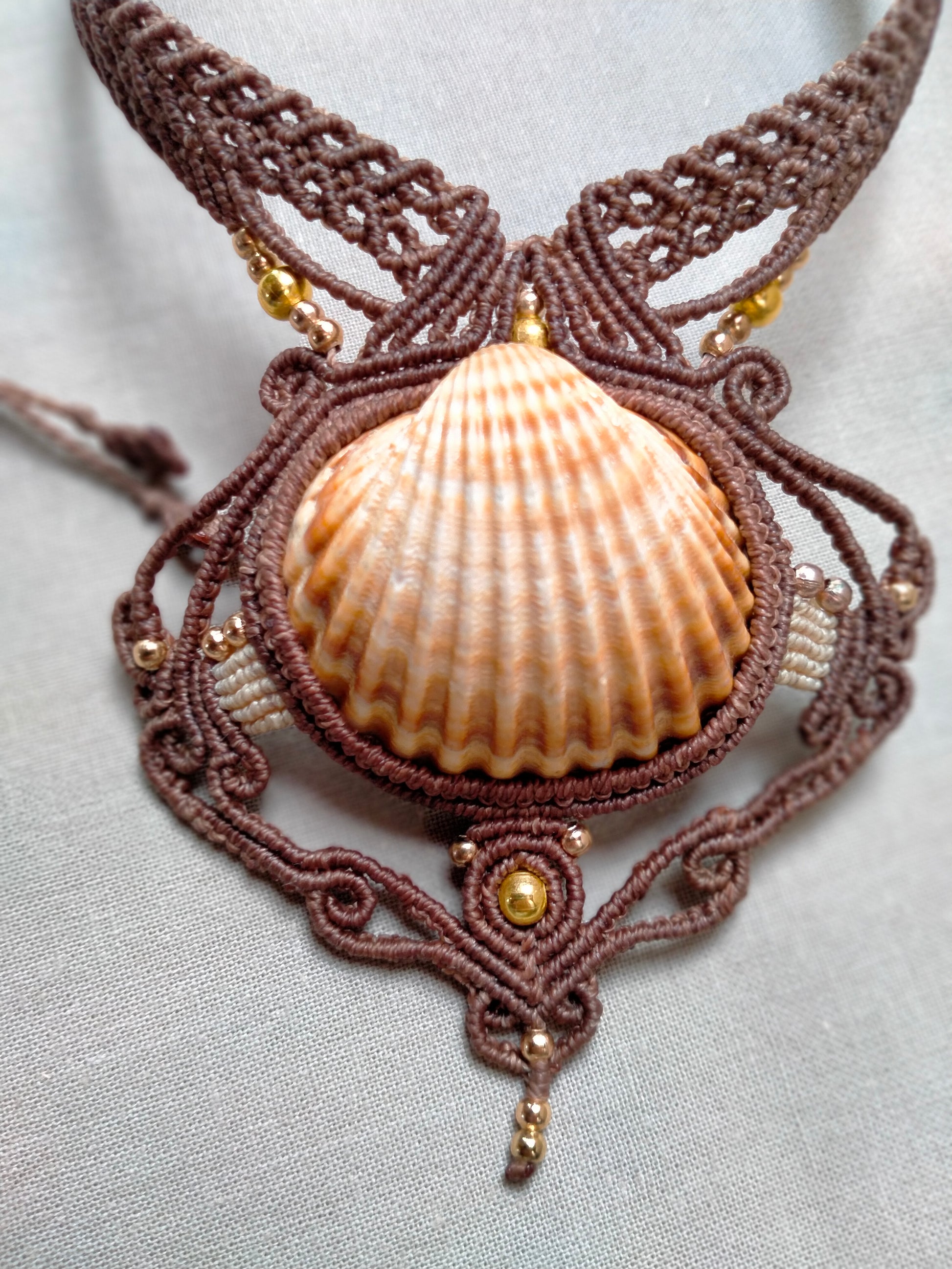 Le Plastron Calypso est la pièce maîtresse de la collection, une création unique en micro-macramé qui évoque la beauté de l'océan et la mythologie grecque.